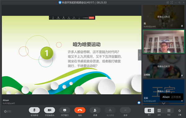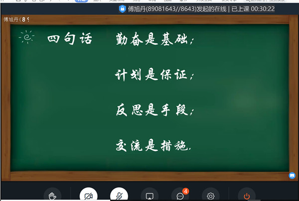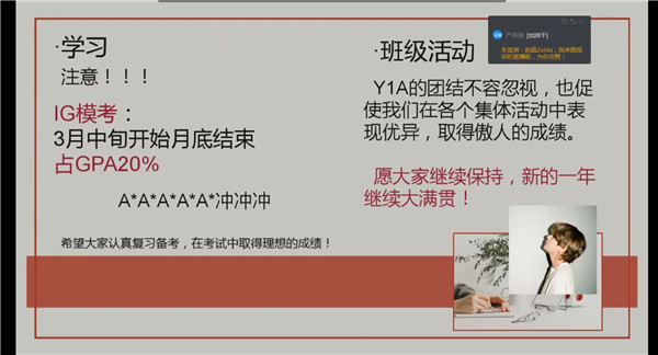 整节线上班会课纪律有序,虽然有某些程度上的技术故障,但都得到了及时处理。同学们都听得非常认真,相信大家一定都准备好了在第二学期为自己的梦想学习而奋斗!