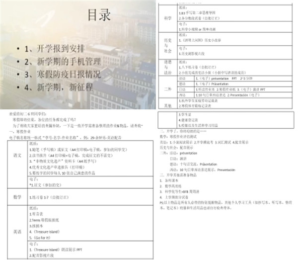 我主要是强调了自己的一些个性代班的理念,以及强调了自己在学生管理当中的一些原则,这样也让学生去做好心理准备。第二部分是对学生的一些假期学习和生活安排的了解。联系安排了两位同学,一个是班长,一个是副班长,让他们把自己的寒假学习计划,生活安排以及对新学期的展望,包括作业的一些视频和照片发给我。一方面是借助这样的方式了解学生在假期当中的一些学习和生活情况。另外由于他俩是班干部,也想为后面班级的管理做好铺垫,用正能量来激励班级积极向上的氛围。第三部分我安排了一些学生照片,让他们知道我在寒假过程当中也对他们做了一些前期的了解,尽可能让他们不因为更换老师和班主任而产生焦虑,以放松的心态迎接新学期。第四部分,就是按照我们年级的要求,把学生报到时应该要注意的事项,以及开学时候的一些期望讲给学生。