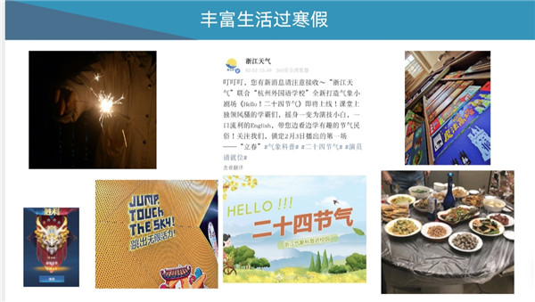 接着,班长王喆炜同学、学习委员汪思彤同学、体育委员王昕祺同学分别以丰富生活过寒假、认真学习过寒假、健康体锻过寒假为主题展示了丰富多彩的寒假生活。其中体育委员别出心裁地使用调查问卷来反映同学们的运动情况。我班张若冰同学参演的杭外二十四节气节目的播出更是使同学们兴趣满满。
