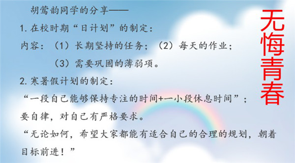 将要到来的新学期只有短短三个月,但要面临的学习任务并不算少,在本次班会的过程中,同学们都明白了未来三个月,大家将要面临许多挑战。从这次线上班会看,同学们对新学期的到来保持着乐观积极的态度,并已经认真地开始了对新学期的筹备。
