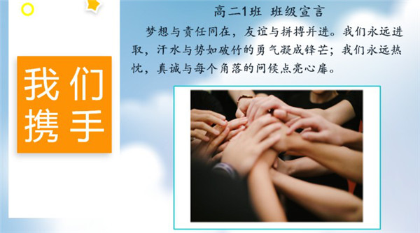 班会课上,焦老师还强调了高二下我们要面临的重大考试:期中考,杭州市统测即期末考,和语文、数学学业水平考试,这些考试对我们而言是挑战,但我们相信在合理规划的指导下,进行高效和自律地学习,一定能攻克它们。班会课的最后,焦老师别有深意地使用了一张我们班同学都很熟悉的照片,这是一张运动会旋风跑前,同学们自发手叠着手互相加油鼓劲的照片,这张提振士气的照片凸显了我们班同学团结拼搏的精神。焦老师借此并联系我们的班级宣言,意味深长地鼓励同学们:对学习,对活动,对生活,我们永葆热忱,全心投入。2021温暖如初,新学期我们携手,朝着目标前进。