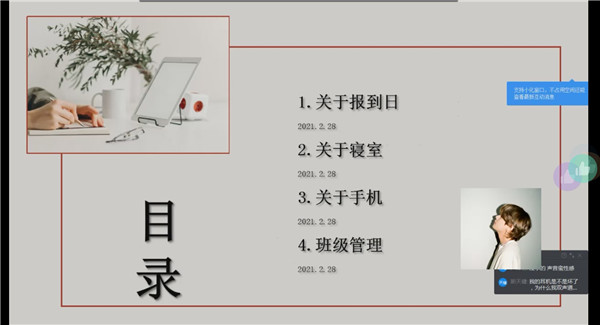 这次班会由何哲浩同学主持,他认真地做了PPT,并且条理清晰地列出了若干个主题。