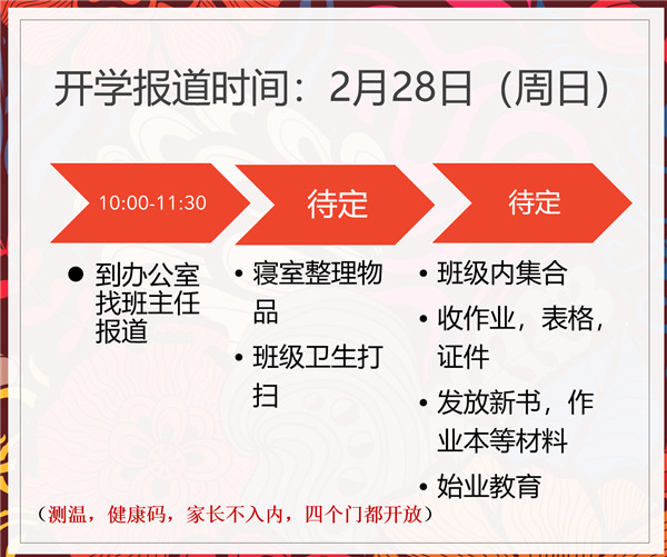 开学在即,黄老师先布置了一些报道的相关事项,列出了需要准备好上交的物品清单。由于全球的疫情风暴还未彻底结束,这次学校仍是严格把控,开学当天不允许家长进校,只能在25、26两天错峰进校整理内务。