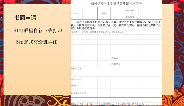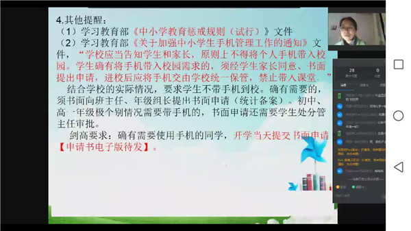 接下来,老师向我们讲述了教育部关于手机的新规定。手机向来是难管控的物品,新学期根据教育部的安排,携带手机入校园的同学需要提出申请,希望同学们支持新政策。
