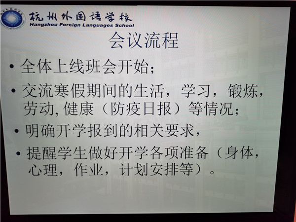 本次班会共分三部分,班主任王文博老师提出了新学期开学注意事项,班长总结了班级寒假的防疫情况,要求大家在余下的寒假时间准时上报,完成任务。