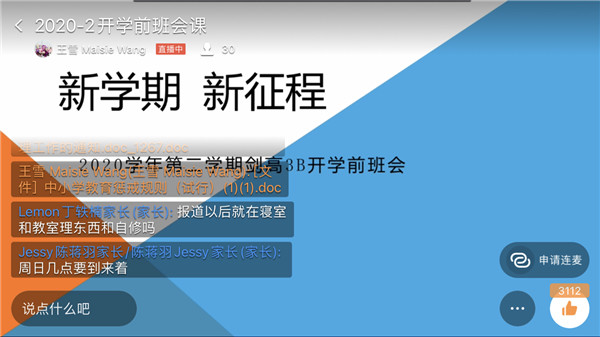 高二A班班会课主要内容涉及假期生活的反馈,报到时间和需要带的物品,同时还公布了班级新学期的座位安排和主要考试安排,让同学们对新学期的生活有了一些期待之余,对于即将到来的新学期也有一些紧迫感。班会课的氛围整体轻松愉快,学生们通过留言和点赞,与班主任老师进行积极互动。