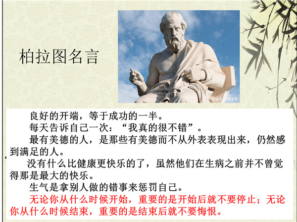 接下来,高二年级组长许海萍老师通过引用柏拉图的名言拉开了德育规范篇的序幕。柏拉图说:“良好的开端,等于成功的一半。”在本学期目标方面,许老师主要提出三点,即学业活动的全面指导,加强感恩教育,中国传统文化的了解和传承,后续各班会据此开展一系列专题活动。许老师还借柏拉图“每天告诉自己一次:我真的很不错”,表彰了上学期的先进班级和星级寝室,并以“最有美德的人,是那些有美德而不从外表表现出来,仍然感到满足的人”,引出美德的内涵,指出能随心所欲而不逾矩也是一种美德。许老师结合我们年级上学期表现不足的方面,重温并强调了一些日常规范,让我们慎重对待自己的言行,对自己的每一个选择负责,知其可为与不可为,心中有规矩,才能在方圆之中随心所欲。