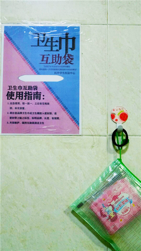 近日,各大高校学生发起“卫生巾互助盒”活动,为忘带卫生巾的女性提供帮助。我校学生会权益中心也关注到了这一行动,在卫生巾互助盒基础上,结合我校实际情况,提出了“卫生巾互助袋”计划。在装着几片卫生巾的尼龙袋旁边贴有“卫生巾互助袋,取一还一”的标识,使用方法简单明了:在月经突然到来而手边又没有卫生巾的窘况时,从互助盒内取出卫生巾,之后有空的时候再放回一片新的卫生巾补充,从而形成循环。希望能够为女学生、女老师们尽一份绵薄之力。