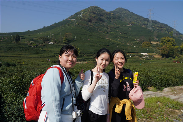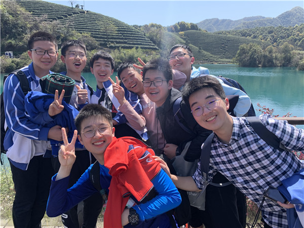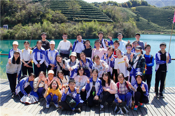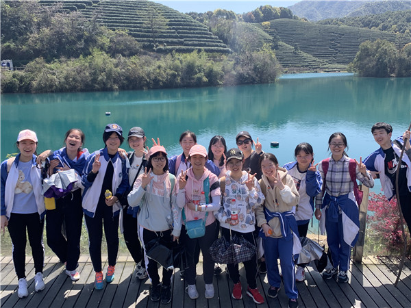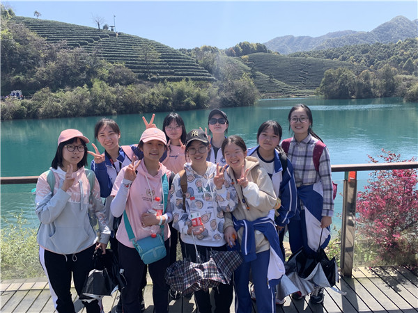 目的地的景色让人眼前一亮:漫山遍野的茶树随着山丘缓缓铺开,茶农小小的身影点缀其间;一汪碧水随着风声呢喃荡起了一圈圈涟漪,水底的群山也跟着摇曳;路旁的群花从梦里醒来,欣欣然地开放着……一幅春光画卷就此展开。同学们纷纷席地而坐,三五成群,尽情享受这悠闲时光。