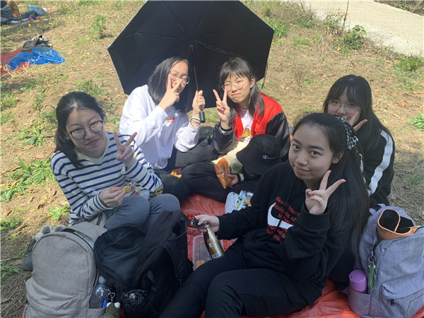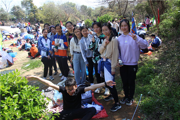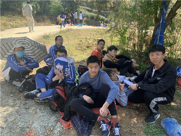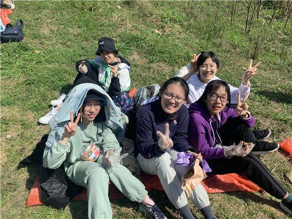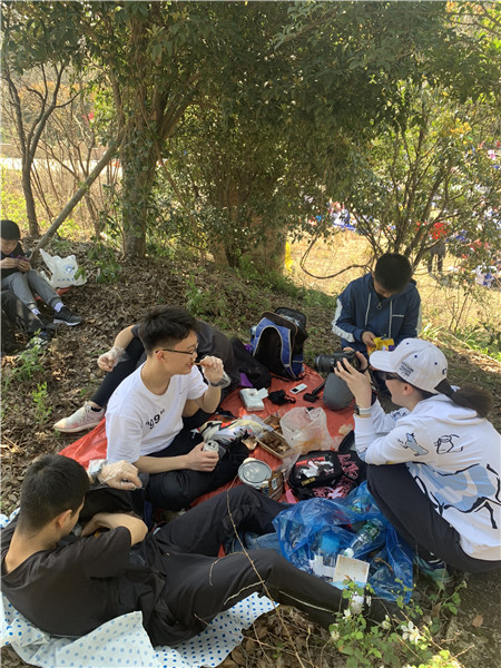 除了登山步行,春游也当然少不了游戏与漫谈。三两成群,五十围坐,玩笑八卦,零食饮料,书本作业。步途带来的疲惫,在两三小时的欢笑中缓解大半。旅途中当然也会有一些小插曲:三四个同学拐错了方向,最终在同学们连线的帮助下成功找回了大部队;好几位同学挂了彩,或是扭伤了脚,或是蹭破了皮,但都在大家的鼓励下坚持到了回程结束。