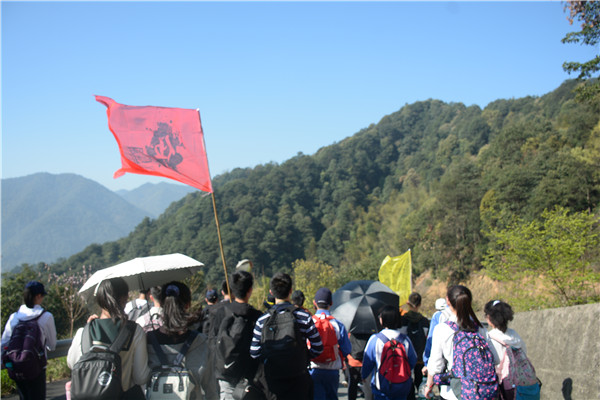 一路高歌,尽管走上十三里路的确有些劳累,但路旁的一切景象都让我感到身心放松。妇女们背着箩筐在梯田中采茶,营造了一种错落美;农民们在家中把采好的茶放入锅中炒,空气中飘着茶的清香,营造了一种萦绕着生活气息的美。走累了,还有hfls志愿者加油助威,支持着我们冲向终点。