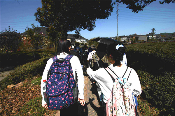 回程时太阳很大,但是我们的热情依然不减。音箱没电了,所以大家用歌声代替了音箱。一班人互相帮助,一个同学帮另一个同学拿上了包,有人给大家买了矿泉水。虽然走得有点累,但是同学们都表示很快乐。
