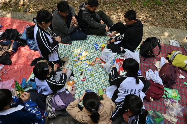 下山后映入眼帘的是阳光下如翡翠繁生的茶林,和散在茶林间的茶农们忙碌的身影。恰好赶上明前龙井开茶节,品茶售茶的牌坊处处可见。小镇深处的骑行公园是我们的目的地,拖着疲惫的身躯走了这么久,一到班里的休息地同学们就铺上桌布坐在地上,拿到尤老师救济的冰淇淋才重新充满活力。但明显大家并不愿意浪费这宝贵的休息时间,各类游戏不久就火热地进行了起来,uno跳棋被堆得满地,这时才有了春游的轻松惬意之感。没有了午餐供应,伙食就成了问题,除了最普遍的面包饼干之外,还有同学带来了自热火锅,又为班里增添了新的乐趣。