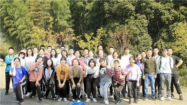 几公里的平路后,同学们已经略显疲态,好在我们的班主任尤老师不辞辛劳,背上了相机和扩音器,成为了我们的“移动音响”。同学们提前点播的音乐风格各异,无序的播放让路途充满了期待与惊喜。不过好景不长,上了山后,延绵不绝的参差石阶令人望而却步,但不断移动的长队断绝了我们停步的念想。无暇欣赏山上横斜的松竹,我们的脚步愈发的沉重,也只能一边后悔带了太多东西一边咬牙向上爬。穿过层层叠叠的树影,我们终于望见了一方天空,看见路边美女学姐们贴心的举牌,才知道我们已经到了山顶。接下来的下坡就显得愉快许多,除了“刹不住车”的无奈和隐隐作痛的膝盖之外,没有什么难熬的。