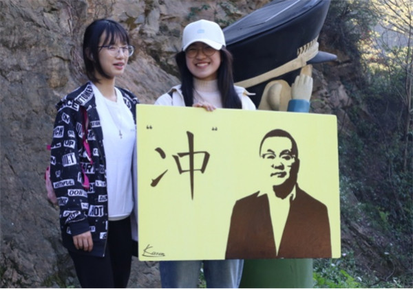 从山脚的石门走进,迎面看见来自大预班的几张亲切的面孔。学姐们的手上举着为我们加油的纸板——如往年的每一次一样,旗上或幽默或积极的话语和插画正是春游中最令我们期待的环节之一。往前走,是直通高处的石板路。一级级不平整的石板踏在脚下,是踏实的感觉,阳光从竹林间斑驳地洒下来,极目远眺,到处是带着青翠又朦胧的一片绿意——倒有许多野趣。