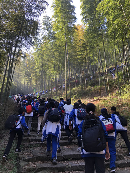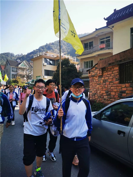 在初中部全部班级集合之后,早上八点整,第一个班级准时从校西门出发。整齐的蓝白校服,每个班独具特色的大旗。刚出发时同学们的步子都是轻快的,心是雀跃的。听春晨鸟雀的啾唧,嗅山野草木的清香。踏上上山的第一块石阶,望向山顶的寺庙,充满希望走向朝阳。可当走过无数级台阶依然望不到石径的尽头时,大预班的学长学姐们举着手绘的标牌站在路边为我们加油打气。看着标牌上的数字“已经完成30%”“距离终点还有50%”再咬牙坚持一下,惊奇地发现下坡的路是盘山公路。