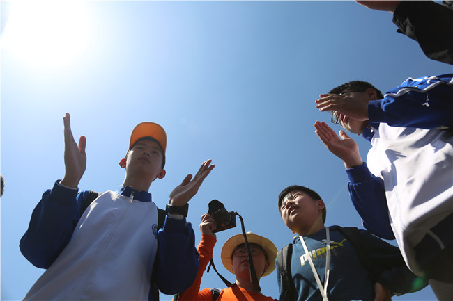 太阳有些刺眼,热情地将它的光与热送给我们。所有人都是大汗淋漓,被浸湿的头发一绺绺地贴在红润的脸颊边。一步、两步、三步,耳边是喘气的声音。道路盘山而上,仿佛永远没有尽头。