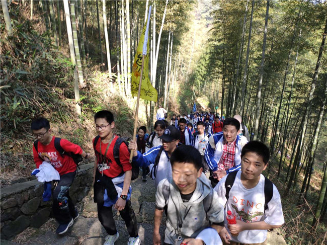 早上,我们列好队,整装待发,迎着朝阳向目的地进发,沿途遇到了不少学姐学长举着牌子为我们加油打气。不知哪位同学带头唱起了军歌,大家便加入了唱歌的队伍,嘹亮的歌声回荡在郁郁的山林中,我们斗志昂扬地往山顶前行。尽管山里有树木遮阳,但汗水仍不住地往下流,6.5km水平距离,实际8公里左右,在这里我们巧妙地用到了勾股定理,可是脑力的消耗远远不及体力的消耗。走的台阶虽然矮,但是很宽,明显就是走两步抬一脚,经历了一番体力的折磨,同学们互相搀扶,也总算上了山顶。翻过山顶,还有很长的路要走,功夫不负有心人,我们终于到达了目的地——龙坞何家村,功德圆满,确实可喜可贺。