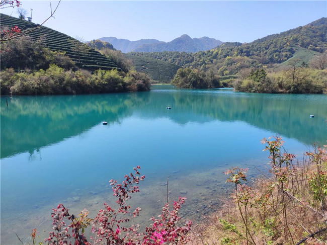 到达何家村骑行公园,它紧邻龙坞光明寺水库。这里山水形胜,茶山环绕水库,保持着“天常蓝,地常绿,水常清,人常乐”的田园风光,鸟语花香,青山碧水。