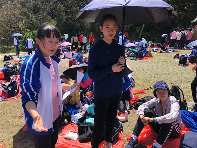 我们班同学分为七个小组,每组组内的同学互帮互助。在出发上坡时就有同学体力不支,节奏缓慢以至于慢慢地落下了大部队好多。但作为组长,一些同学即使能走到前面,却也放慢脚步留下来陪掉队的同学,走到前面了就停下来回头等他们一会。或许平时下课打打闹闹时而斗嘴,但此刻我们都成了好兄弟好姐妹,互相加油鼓气,只为攀上顶峰。