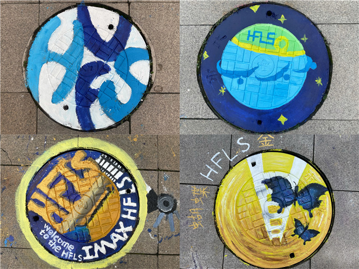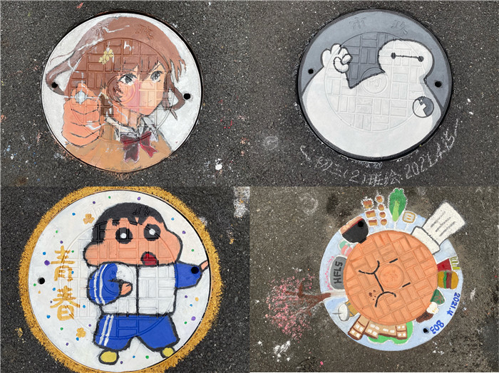 经过绘制的井盖不再是阴沉的灰色,各种亮丽的色彩足以使老师和同学们以及学校来访者眼前一亮。明快的色调与多元化的内容,作为杭外一道新的风景线沿着道路延伸开来,错落有致的装点恍惚间给人一种焕然一新之感。