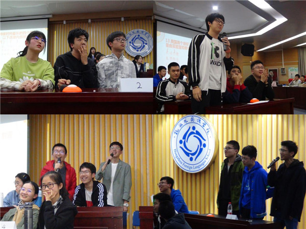 一号楼6楼,举行的是高一年级知识竞赛。在每班代表队热情自我介绍,喊出独特的队名,简短模拟答题并了解参赛规则之后,比赛正式开始了。参赛选手不愧是各班学识与智慧的担当,在第一轮的车轮战中,不论题目难易,他们都沉着思考,冷静分析,最后自信地说出自己的答案。在选手需要帮助时,各班后援团也表现出了丰富的积累与良好的素质。而在之后的自选题和抢答题环节中,高难度题目层出不穷,但参赛选手始终保持着从容自信的答题状态——对每一道题目都认真思考,果断作答,经过一场难分胜负的比赛,最终高一(4)班代表队更胜一筹,杀出重围,夺得了高一年级组的桂冠。