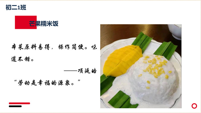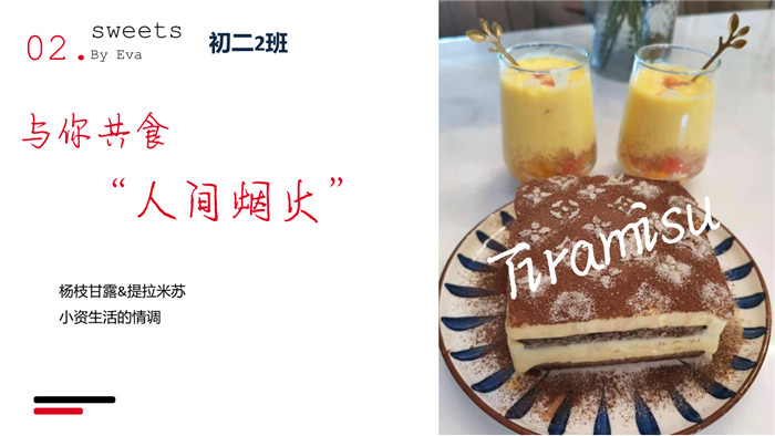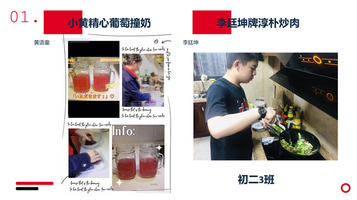 有的同学选择了做简单的蛋炒饭,有的同学借助家里的器材制成了饼干、蛋糕等。绿豆糕、百香果柠檬凤爪、松鼠桂鱼、红烧肉卤鹌鹑蛋、紫薯奶酪丸+芒果西米露……各色食物琳琅满目。同学们用照片和视频记录下了他们在厨房里辛勤劳动的身影。一盘盘,一道道,甜点硬菜层出不穷,中西碰撞精彩纷呈。暖心又暖胃的家常小菜、充满地域风情的老家特色小吃,每一张照片,都是同学们的倾情之作,每一帧画面,都呈现了大家心底的一抹无法忘怀的味道。