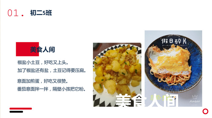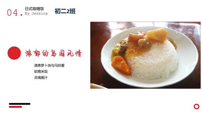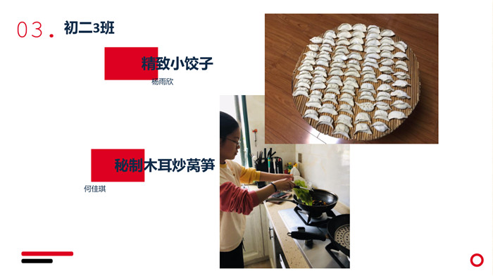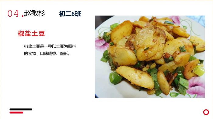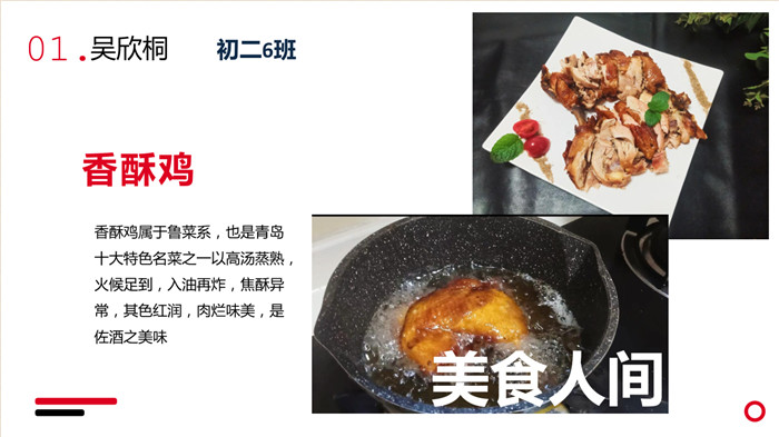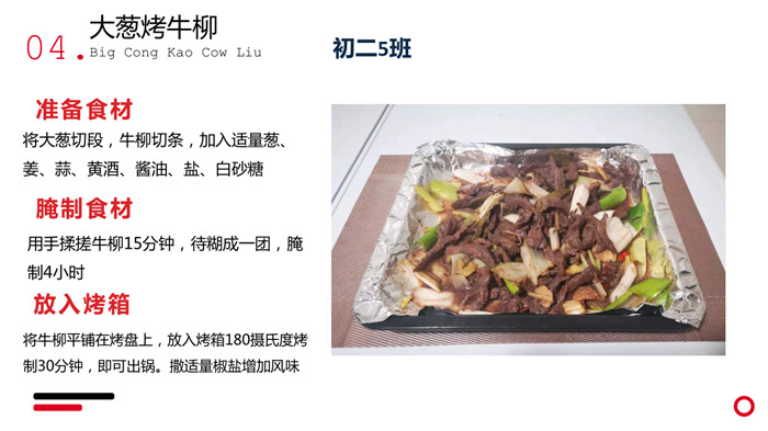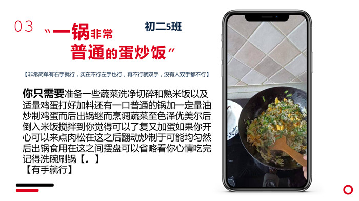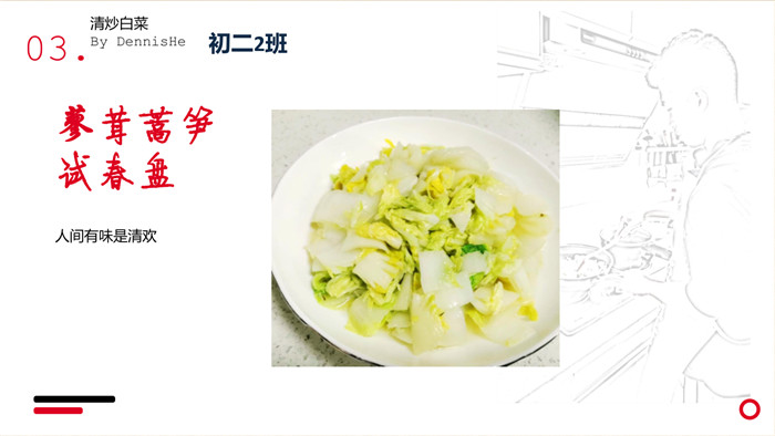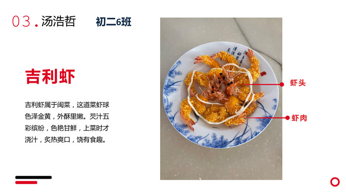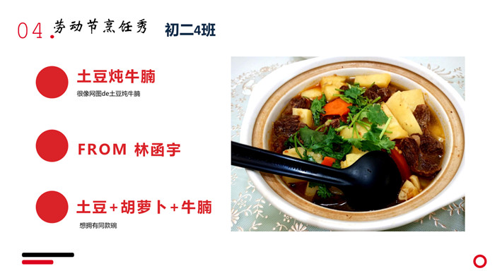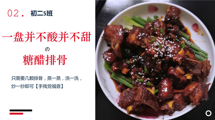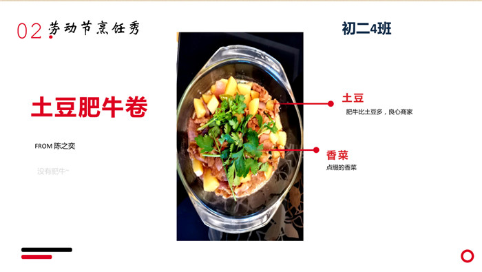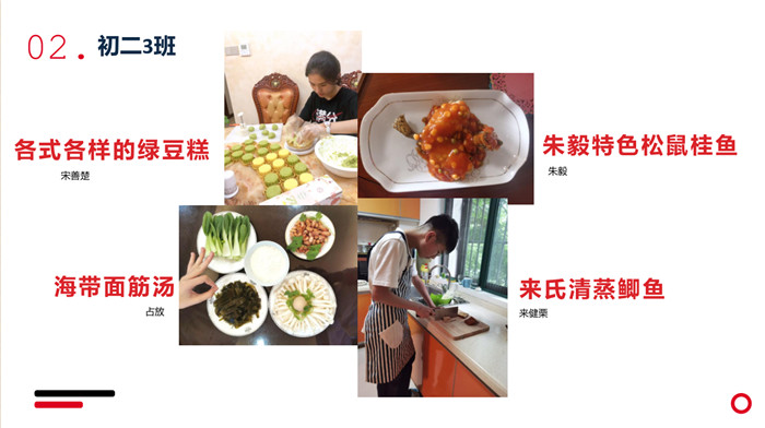 “不计食材购买时间,光是在厨房就忙碌了一小时五十分钟。经过了洗、切、烧等一系列流程,深切体会到了做菜的不易。更深切体会到的是,我们的爷爷奶奶,爸爸妈妈,学校食堂师傅,日复一日,年复一年为我们准备美味可口的饭菜,我们有时候还挑三拣四,嫌东嫌西,真是年少不懂事。感谢为我们一日三餐付出的每一位爱我们的人!”来健栗同学在介绍他的作品时说。