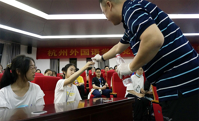 你知道球衣的材质和可乐瓶是一样的吗?为什么衣服湿了颜色看上去会深一点?你看到过“黄金雨”吗?5月16日晚的报告厅,一个个有趣的问题和神奇的实验现象让同学们应接不暇,受益匪浅,原来是浙江理工大学的杨雷教授在为初二年级同学作关于“化学与生活”的讲座。