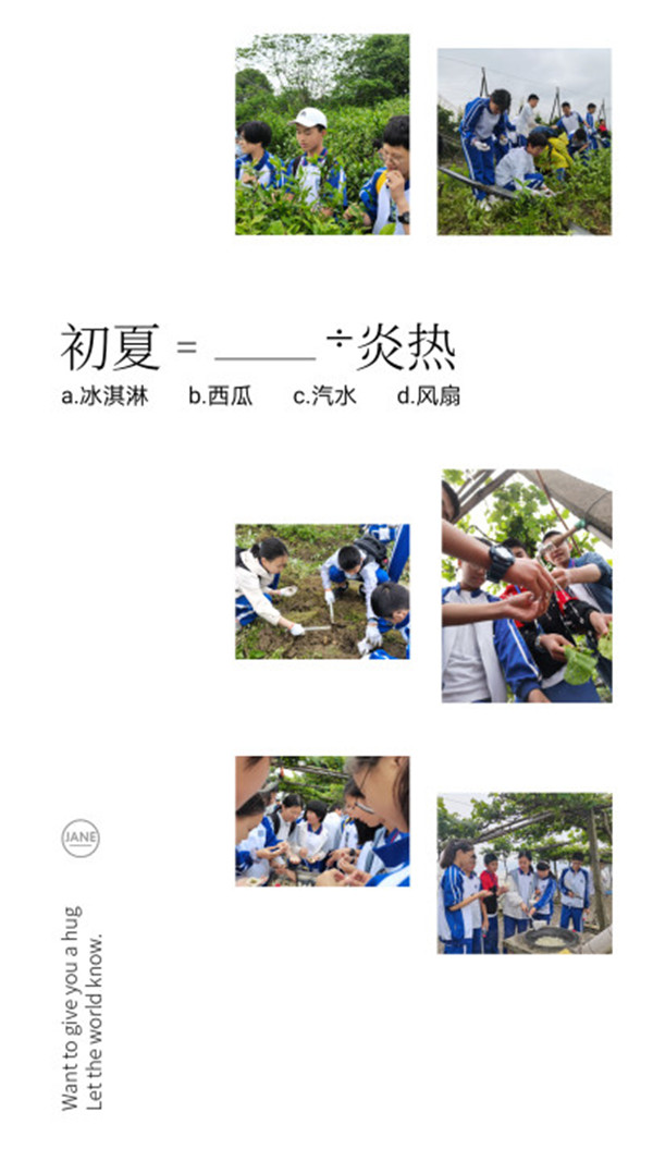 正如三毛所言“岁月之美,在于它必然流逝”,我们无须在意身后的风景,只需载着时间的齿轮向前行,欣赏时间的万花筒中千变万化的生命,去奔赴一些有意义的事物,而劳动恰恰就是其一。看到大家对脚下这片土地的留念,我却认为,我们应将学到的东西付之于现实,将内心的热情匿藏于表面,将其在热血中化为对世界的回馈。