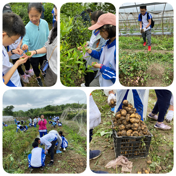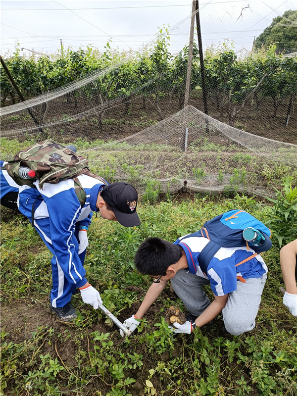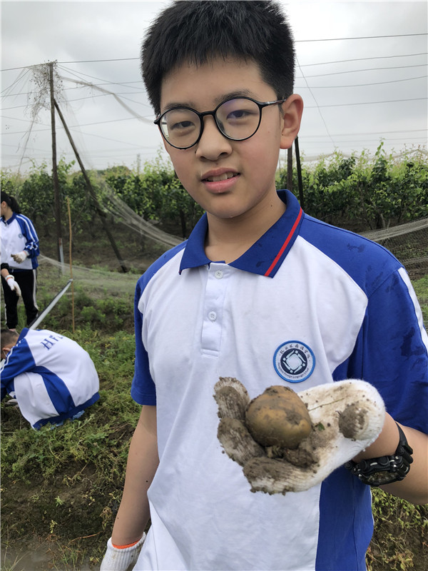 土豆已迫不及待地召唤着我们。采完茶叶,同学们纷纷戴上手套,有些同学还分到了一个小锄头。先把土用锄头锄松,再用带好手套的手扒开已经被锄松的土,就有可能挖到一窝土豆——这就是我们总结出来的挖土豆“大法”。 同学们三个一群,五个一伙,一锄头下去,挖出的不一定是土豆,还可能是捣到了虫子窝。挖出来的土豆有大有小,奇形怪状,有的像球,有的像葫芦娃,也有的是几颗长在了一起连成。当然也有一些土豆被同学不小心“拦腰截断”了。在一片热火朝天的景象下,麻袋没过多久就被装满了,我们的任务也完成了。