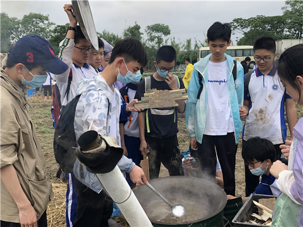 洗锅、拿食材、洗食材,在一片乒乒乓乓的声响中,锅已架好、食材已洗净,生火小组却遇到了困难。带着火种的木块刚放入灶膛,不是因为燃料不足而熄灭,就是被过大的木块而闷灭。在各种木材乱成一箱的柴火中,生活经验丰富的托尼相中了量大而质轻的稻草,往里一扔,火便猛地窜了起来,锅中的水也开始吐着气泡。而就在这时,麻烦也来了,土灶排出的烟愈发浓烈,熏得人晕头转向。在发现扇子的功率难以与之匹敌后,有同学十分生猛地直接拿来了雨伞开始扇,浓烟果不其然地飘向了远处。