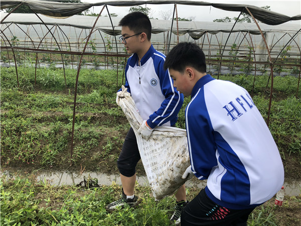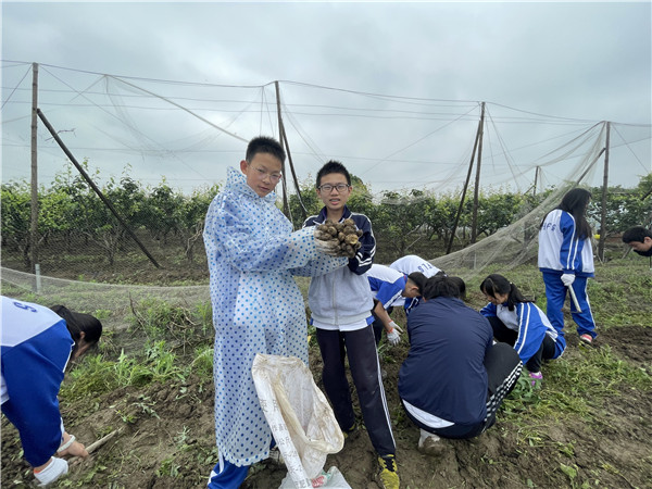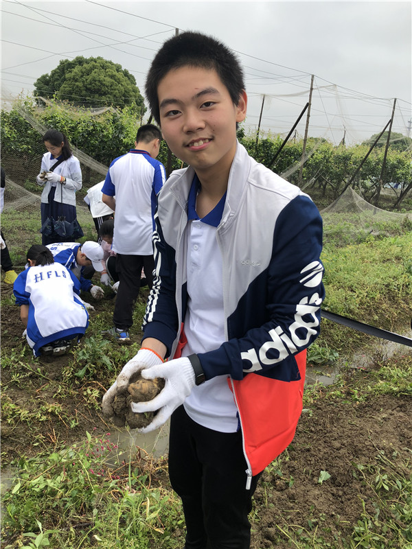 陈罗鑫:这次学农活动,对我来说收益颇多。在这半天的时光里,我也是体会到了农民伯伯的不易和劳动过后的成就感。前天晚上下了暴雨,地里有非常多的泥浆,许多次我都差点摔倒。在蚕豆棚里自以为已经把豆子收干净了,回头收杆子的时候发现到处都是剩下的蚕豆;埋头一顿乱拔,自以为拔得差不多了,一看却还有一大片。这样的蚕豆棚我们班一共处理了近3个,劳作后的同学们饥肠辘辘,学校给大家提供了玉米和土豆,就连平时不是很喜欢吃煮土豆的我也吃得津津有味。接着大家开始生火烧中饭,包饺子、生火、洗菜、掌勺、分碗,同学们分组忙开。我和汤浩哲负责炒年糕,10斤年糕分了三锅炒,作为掌勺的我们,受到了同学们的夸赞就是最值得高兴的事情,但是美味的午餐是大家共同努力创造的,感谢其他同学不遗余力地协助帮忙。希望高中的学农我可以做得更好。