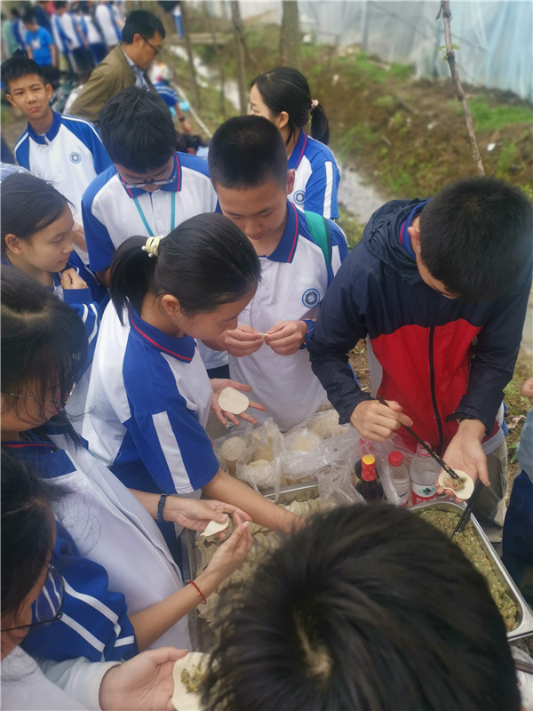 到了中午,我们就开始了最激动人心的环节——烧饭,老师们刚说可以开始,大家便热火朝天地忙碌了起来,包饺子的,洗菜的,烧火的,大家根据分工,有序、协调地为午饭做着准备。烧火的同学拿着打火机,努力将一束束的稻草点燃,然而风太大,好几次都未能成功。最后,王老师、何老师与同学们一起对着炉灶扇风,加柴,这才使一簇红色的火苗在灶膛里熊熊燃起。而包饺子的女生们各显“神功”,不尽包得好,并且速度非常快,一大盆饺子里,可以挑出露馅的,或是奇形怪状的:比如馄饨或是包子,甚至还有许多的“韭菜盒子”。当第一锅饺子出炉时,同学们已经在土灶后拿着碗排起了长长的队伍,一把一把的柴草被塞进了灶膛,火红的火舌烧着黑呼呼的铁锅,锅里的热气冒了出来,香味顺着锅盖溢出,揭开盖子,一阵白雾过后,一个个完整的饺子浮在水面上,调皮地翻滚着,大家吃着分到的饺子,感到心满意足。
