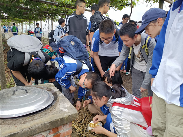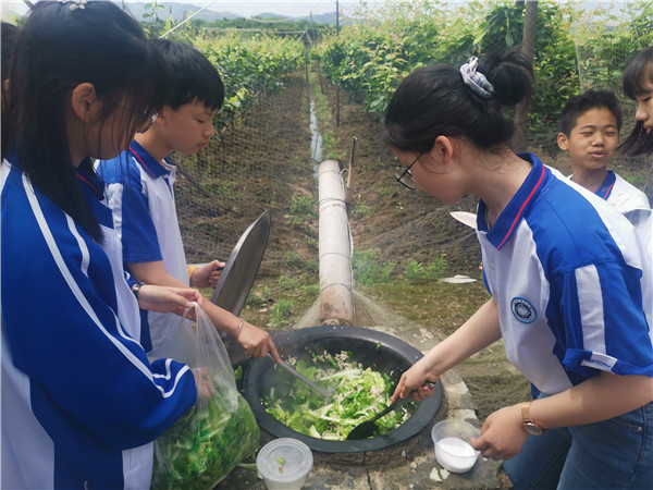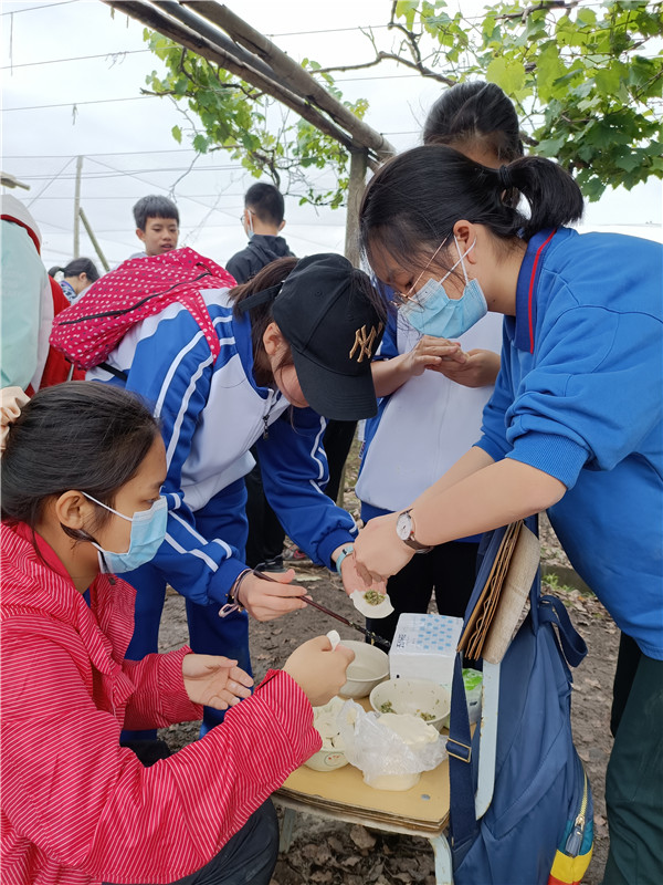 刘轩铭:本以为干农活只需要力气的我们,被到来的第一个挑战当头一棒。花菜的根部变质,里面充满了散发着奇异气味的汁液。根茎也异常难以拔除。很快,大家的手套上都沾满了恶臭的液体。但这并没有打击到我们的信心与昂扬的斗志。一颗又一颗,半个小时后,我们完成了这项“有味道的任务”。当然,蚕豆也是一样。田里遇到了菜花蛇,我们也没有乱作一团,惊慌失措,仍然齐心协力清理完了蚕豆田。野炊的锅具十分简陋,几个有经验的同学三下五除二解决了生火问题。有人负责炒菜,有人负责加盐放酱油,有人来帮忙盛菜。有条不紊,即使锅具浓密烟雾让烧火和做饭的同学们叫苦连连。不愧为“自己动手,丰衣足食”。虽然条件简陋,但是这“胜利”的果实让全班同学都感到自豪。