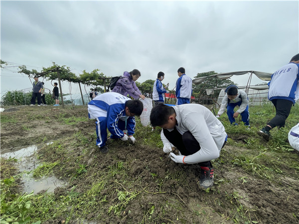 汤浩哲:这次学农主要分成三个部分:摘蚕豆,除杂草,做中饭。我很“幸运”地全都体验了一回。相比摘蚕豆和除杂草,烧菜更干净些。大鹏里的泥土上爬满了蜈蚣、蜘蛛和蚂蚁,我是不怕的,但身边中有些同学吓得“魂飞魄散”,尖叫连连,其中也包括个别人高马大的男生。烧菜是我和陈罗鑫的主要工作,我们烧的青菜炒年糕,一共三锅,一锅更比一锅强,最后一锅把我带来的金针菇、青椒、牛肉、火腿肠都用上了,大家吃得不亦乐乎,连连称赞我们“贤惠”。总之,这次学农还挺有趣的。