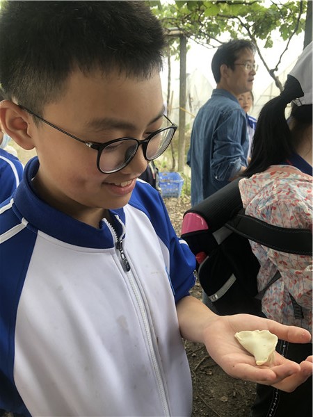 裘宛锦:一个半小时车程后,我们来到具有乡村气息的良渚,一缕缕炊烟从翠绿的玉米地中升起,绿叶上都沾着清晨的露珠。不久我们便被热情好客的村民带去一个种满与肩同高的青菜的大棚,迎面而来的是数不尽的小飞虫。好不容易逃脱了闷热的大棚,我们又来到泥泞的地里拔包心菜,还要求连根拔起。终于,我们走出泥地来到了大灶头前。接下来便是完成各自的分工,包饺子,洗菜,烧火大家都玩得不亦乐乎,都将脚上的泥土抛之脑后。一锅锅香喷喷的饺子出锅后,同学们无不争先恐后去盛上一碗,腾腾热气间是同学们灿烂的笑容。