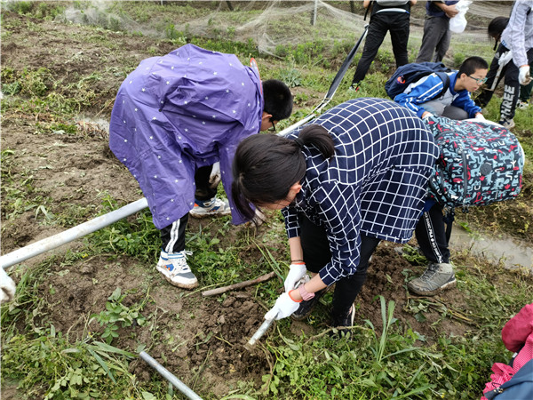 即使因为雨天而延迟了一小时出发,同学们的兴致依然高涨,车刚一稳住,大家便争先恐后地涌出车厢,奔向我们的第一个战场——马铃薯地。
