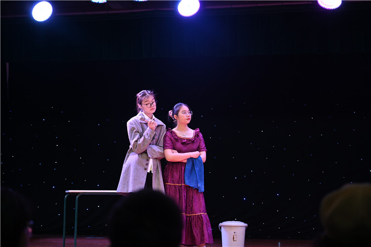 六班同学带来的Necklace将世界小说之父契诃夫的作品搬上了舞台,自短篇小说改编而来的短剧展现出了它的一大优势——保证了故事的完整性。从服装到场景的切换,每一位演员都配合得天衣无缝。四班的And then there were none片段紧接三班同学的表演,将情节的发展推上了高潮。一个个来宾的离奇死亡,逐渐减少的小瓷人,打碎了岛上剩余的人对未来的幻想,打破了彼此间的相互信任,在暴露了人们可怕的欲望的同时,还展现出了四班同学们精湛的演技。最后出场的是一班的Les Misérables,歌剧的形式丰富了整部剧的情感表达,具有极强的艺术感染力。
