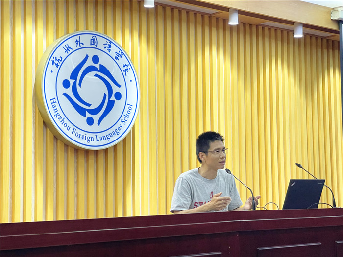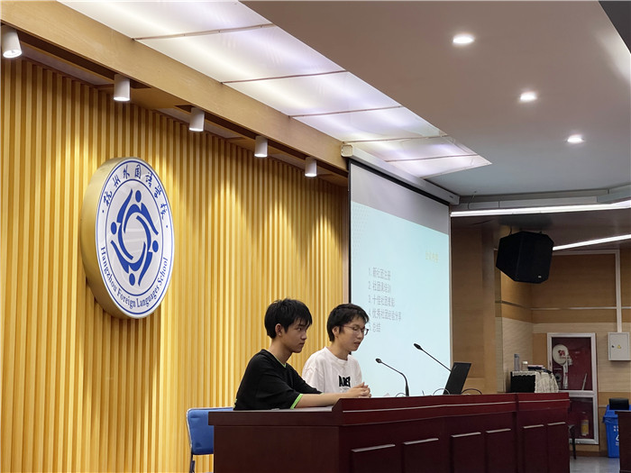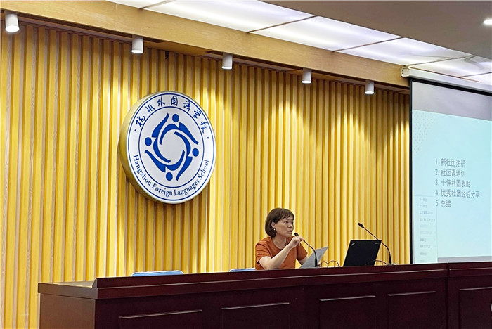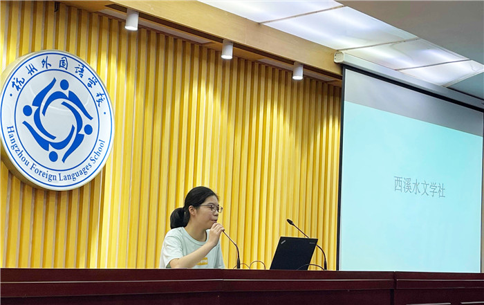 西溪水文学社社长高三4班朱晏上台发言。作为成立于1982年、杭外历史最悠久的社团,其采取半自主化管理,部门分工详细(模块策划、美编文编、宣传),在指导老师带领下定期组织现场作文大赛、外校文学交流活动(杭高鲁迅社)、团建、座谈会以及社刊编撰等活动。