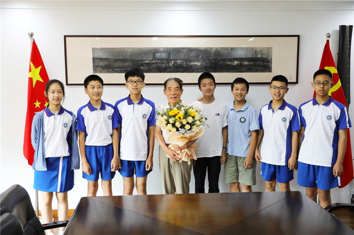 (浙江省关心下一代工作委员会副主任江坪爷爷与杭外学子唐卓昀、袁朗、傅宇、申屠清华、胡恩喆、毛佑然合影留念)