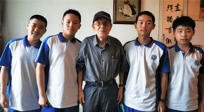 (抗美援朝老战士徐力行爷爷与杭外学子郑清元、龚李瑞、蒋松逸、吴昊宸合影留念)