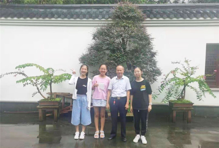 (老党员陆金海爷爷与杭外学子张彤萱、马暄、吴雨桐合影留念)