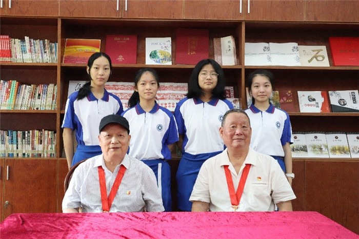 (老战士方正贵、方正荣爷爷与杭外学子唐静怡、孙乐、张雅雯、何书畅合影留念)