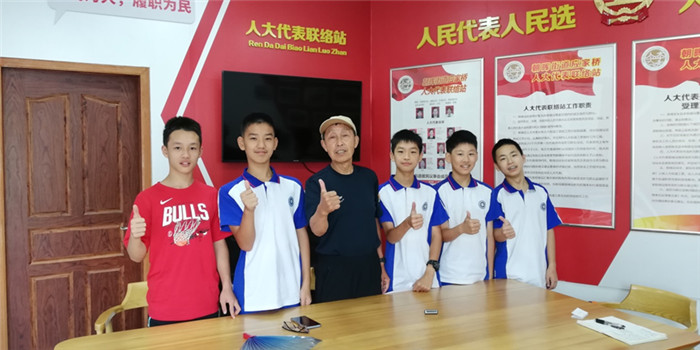(老党员钱爷爷与杭外学子李馥地、郑和易、虞子皓、庄杰森、朱嘉洋合影留念)