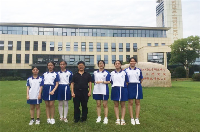 (生物质材料专家姚献平教授与杭外学子姚梓馨、胡佳姿、王熠宁、句潘訸、戴思予、陈晴合影留念)