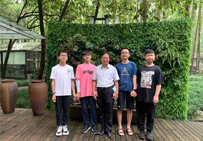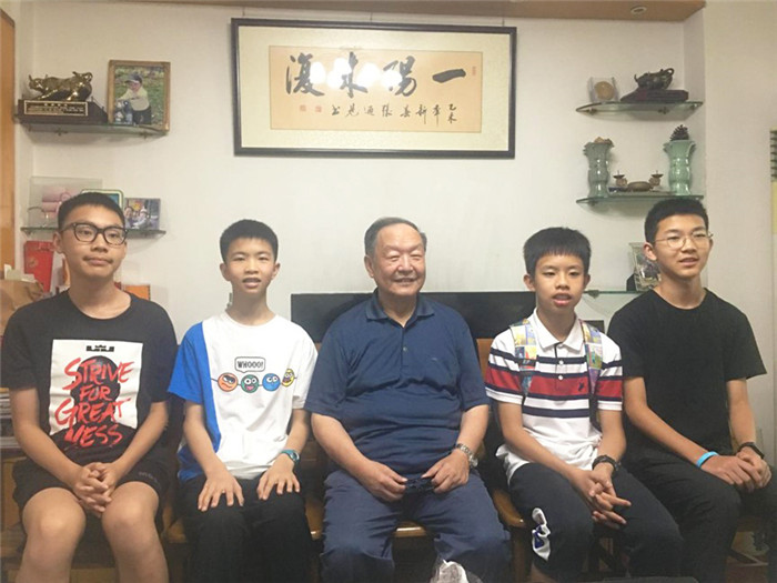 (医学专家石一复爷爷与杭外学子黄雨默、谢景辕、叶易晗、蒋文宇合影留念)