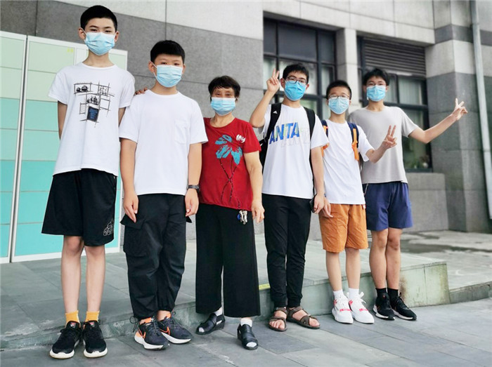 (老党员雷玉冰奶奶与杭外学子姜车、余若宇、陈劲松、严皓、王语帆合影留念)