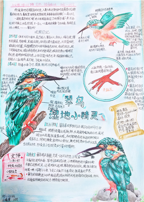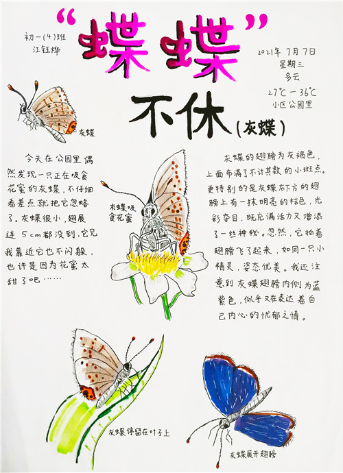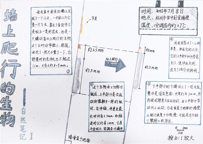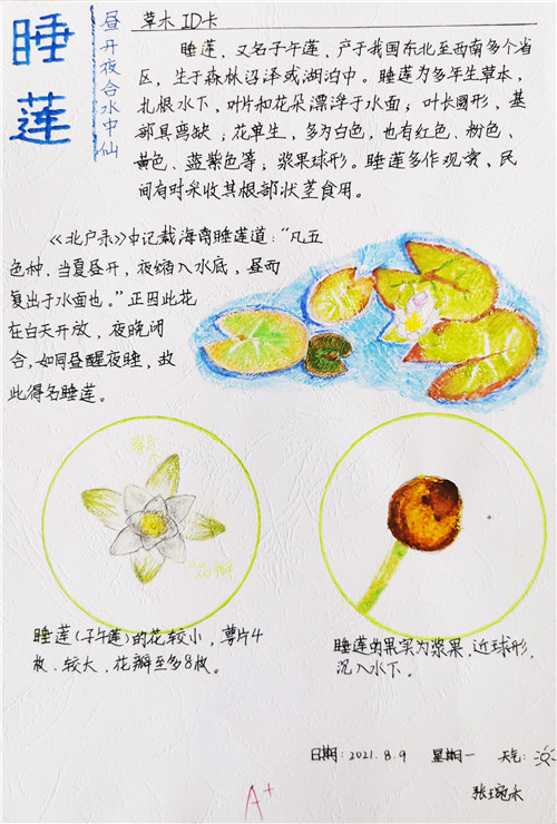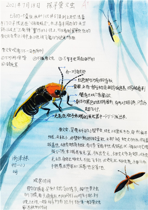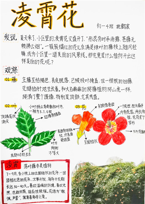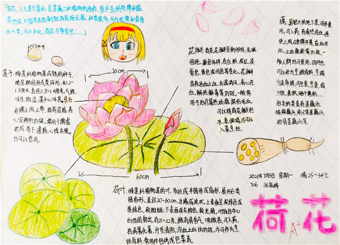说实话,科学是我四科中比较薄弱的学科,因为开始学习科学比较晚,对于科普的阅读也不多。令我印象最深的科学假期作业是自然笔记。我去西湖边实地考察,拍照,记录下植物的颜色、外形及其结构,又上网查询了一些资料。为了完成一幅莲花的观察笔记,几易其稿,花了我一整个下午的心血。这段经历不仅让我对身边的自然景物有了更深入的观察与了解,更激发了我对探寻未知的兴趣与好奇。