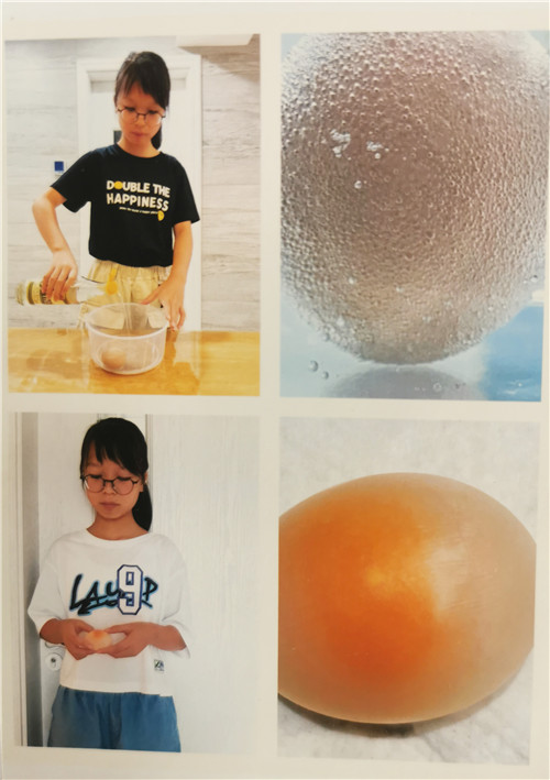 “我为了完成这两个实验,共消费了8个鸡蛋,几乎都是操作不当引发……“一个同学正对他的鸡蛋浪费史侃侃而谈,原因主要是操作不当,比如在醋泡鸡蛋时,拿筷子搅拌结果不小心捅破了;瓶吞鸡蛋中不小心打翻了瓶子;瓶吞鸡蛋时瓶口太小把蛋挤裂了……事后他表示,再也不想吃鸡蛋了!那是因为几乎所有因实验失败品都进了他的肚子里!总而言之,为了练习动手实践的能力,鸡蛋被玩坏不少。但我们玩得很开心!